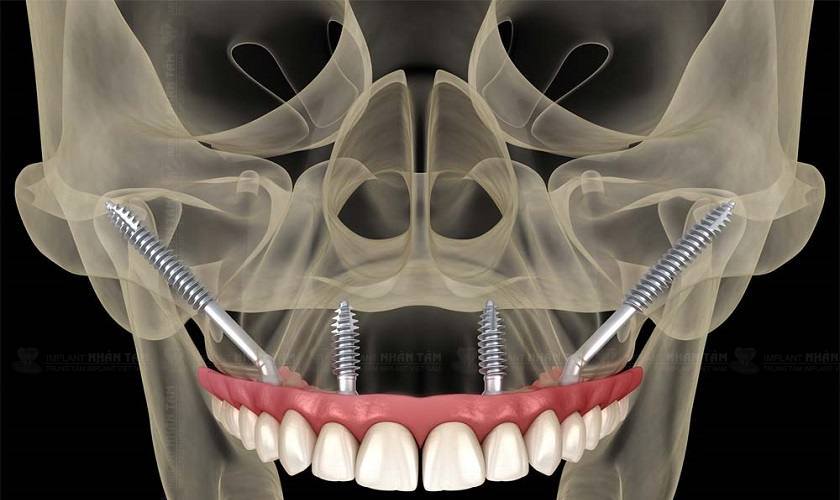 - Lựa chọn 2: Đặt 4 Zygoma implant (mỗi bên 2 Implant), mà không cần đặt thêm Implant thông thường ở vùng răng trước.